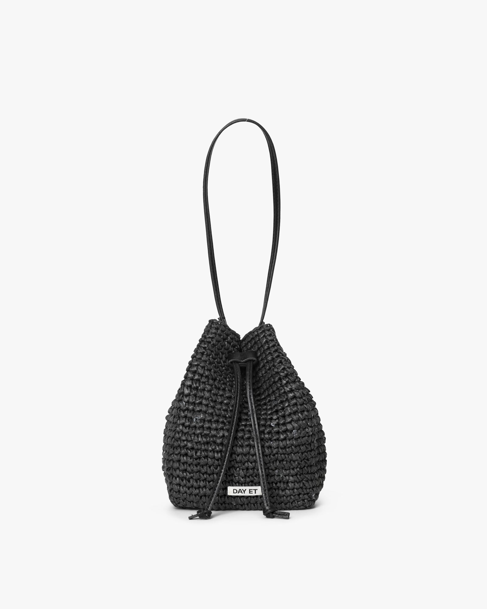 En moderne bucket-taske i blødt, hæklet stråmateriale med et enkelt og funktionelt design. Tasken har sort for og en smal hank i et læderlignende materiale. Den lukkes med en smal strop, som er vævet langs kanten og sikret med en lille stopper. Den faste, firkantede bund sikrer, at tasken står stabilt.