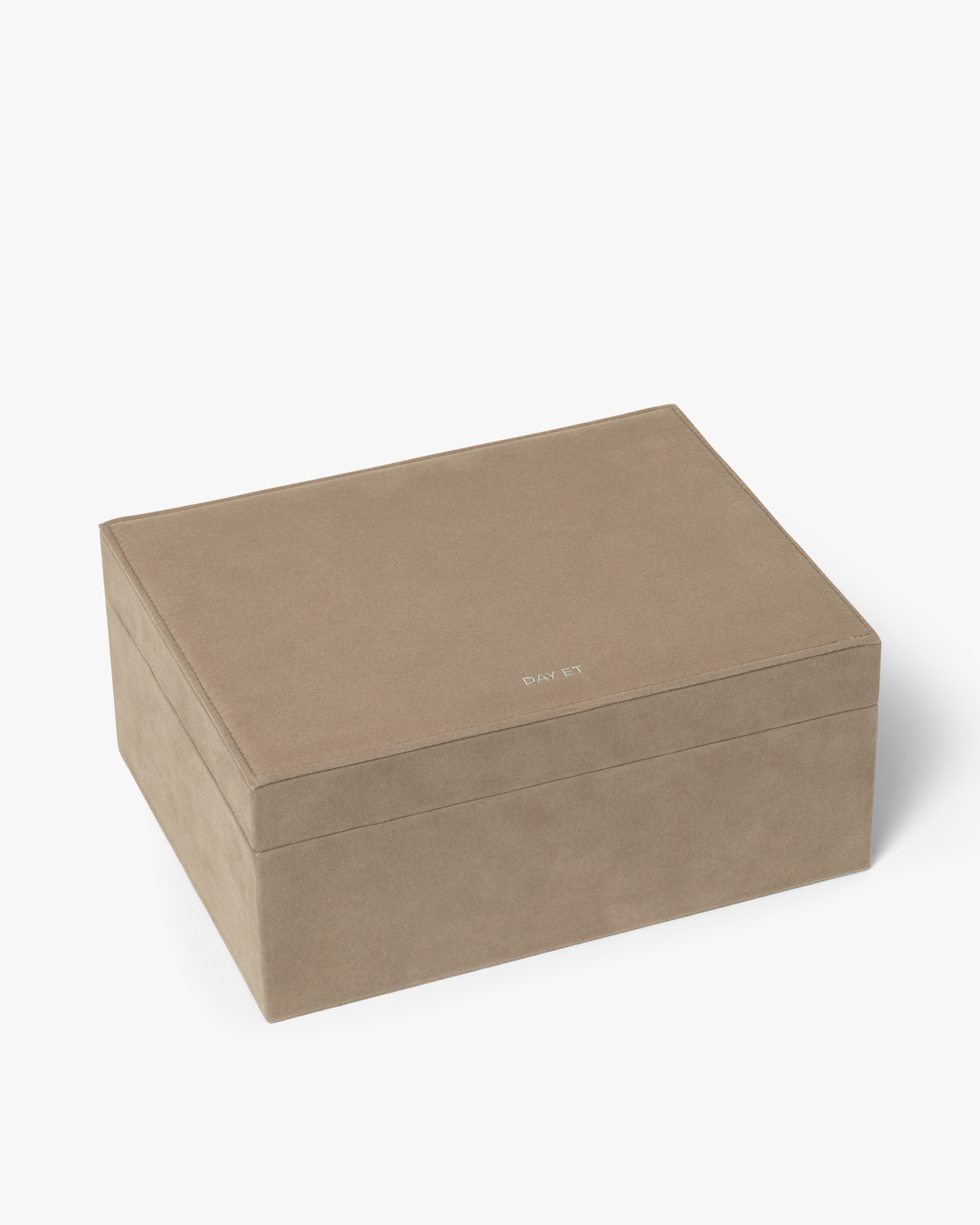 Dette rummelige smykkeskrin er perfekt til opbevaring af alle dine smykker. Det er designet i velour, og fortil har det Day Et logoet i sølv. Det har en magnetisk lukning, og indeni har det flere rum, så du kan organisere dine smykker. Det har også en bakke, som kan løftes, hvilket giver et ekstra rum, hvor du kan opbevare dine smykker.