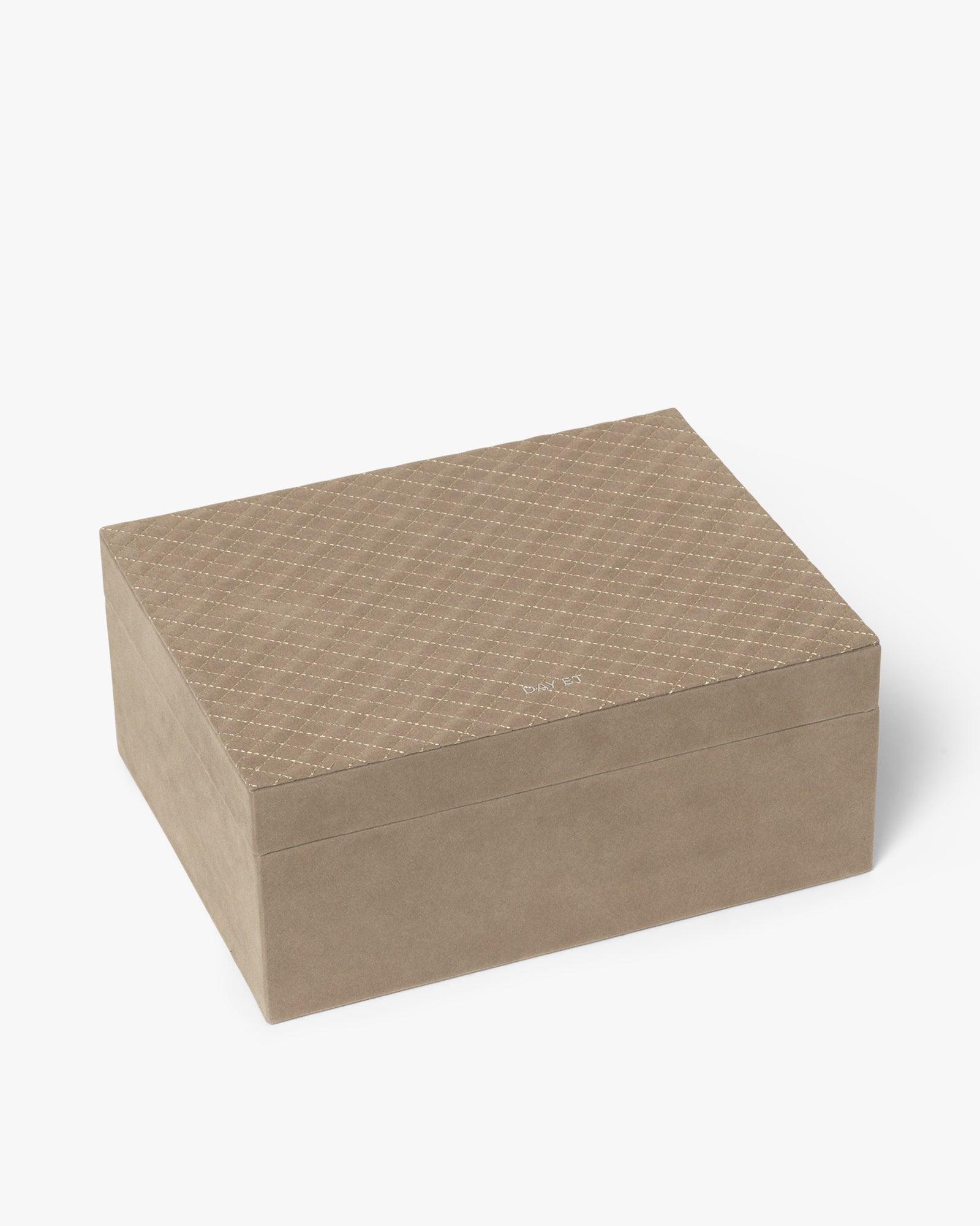 Dette rummelige smykkeskrin er perfekt til opbevaring af alle dine smykker. Det er designet i velour med quilt detaljer, og fortil har det Day Et logoet i sølv. Det har en magnetisk lukning, og indeni har det flere rum, så du kan organisere dine smykker. Det har også en bakke, som kan løftes, hvilket giver et ekstra rum, hvor du kan opbevare dine smykker.