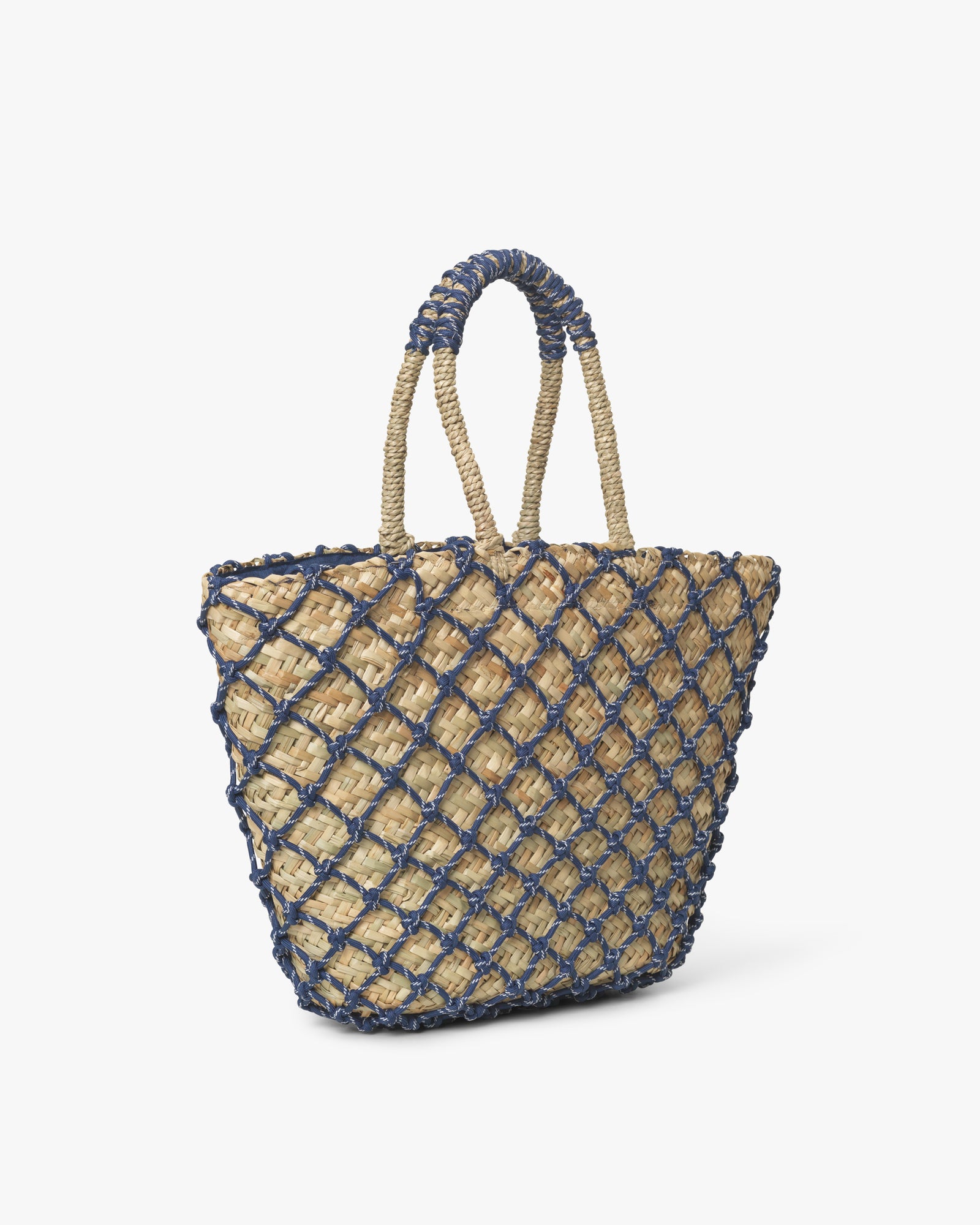 Denne flettede stråtaske kombinerer en klassisk form med et unikt design - et dekorativt netmønster i knyttet snor, der også er snoet om hankene for et særligt twist. Tasken har en åben form og indvendigt findes en praktisk sidelomme i sort læder til opbevaring af mindre genstande.