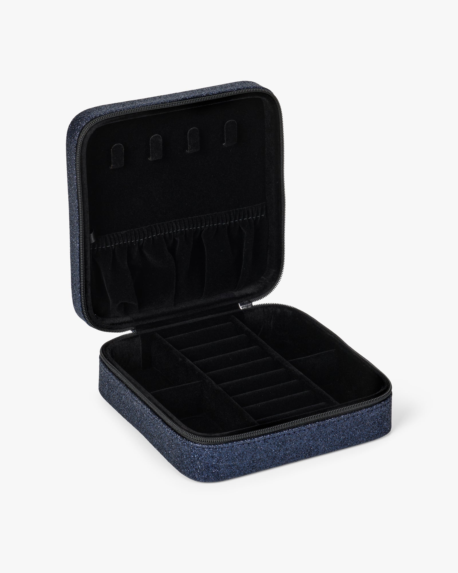 Et større smykkeskrin med god plads til organisering. Det mørkeblå glimmermateriale giver et dekorativt ydre, mens indersiden i sort velour rummer flere praktiske rum og kædeophæng i låget. Lynlåsen holder indholdet sikkert samlet og gør det nemt at tage med.
