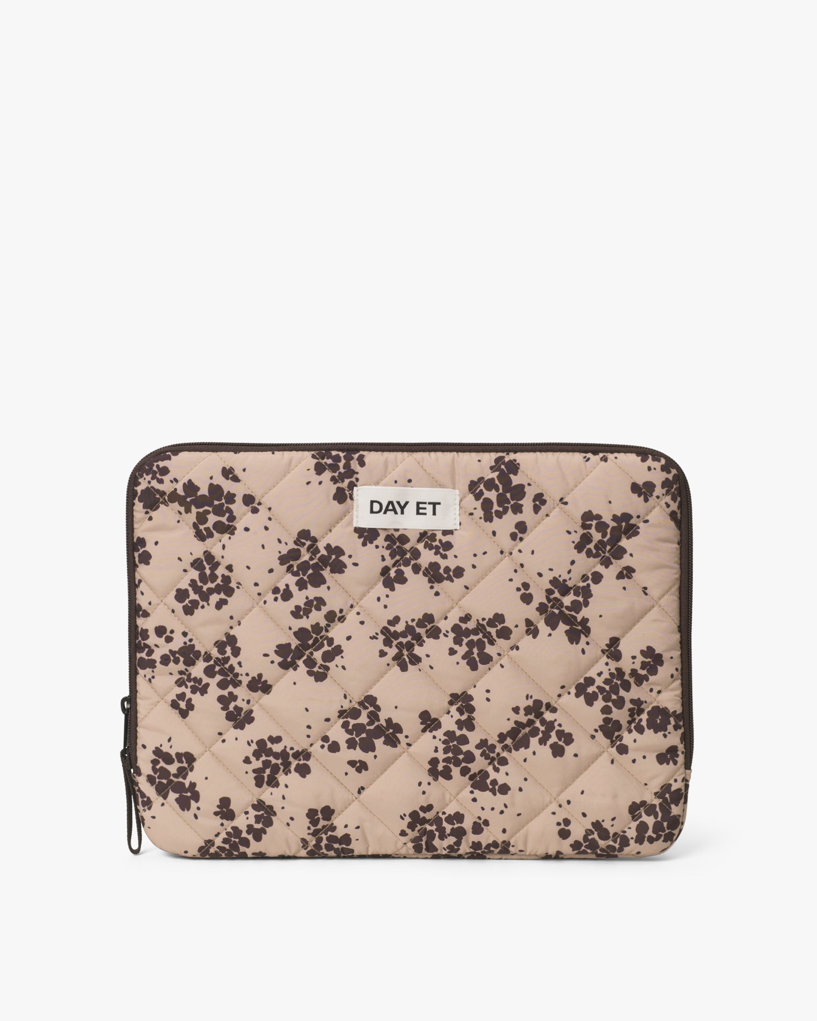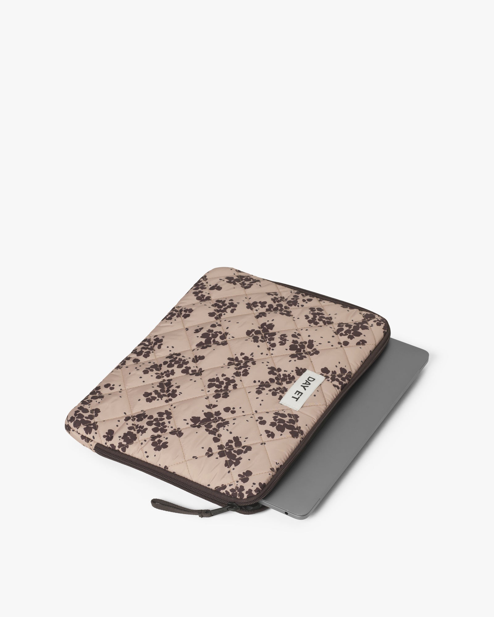 Et polstret computersleeve til en 13" laptop, designet i quiltet materiale med blomstret print. En åben sidelomme indeni giver ekstra plads til papirer eller småting. Lynlåsen åbner bredt, så du hurtigt kan komme til din computer – perfekt til både arbejde og studie.