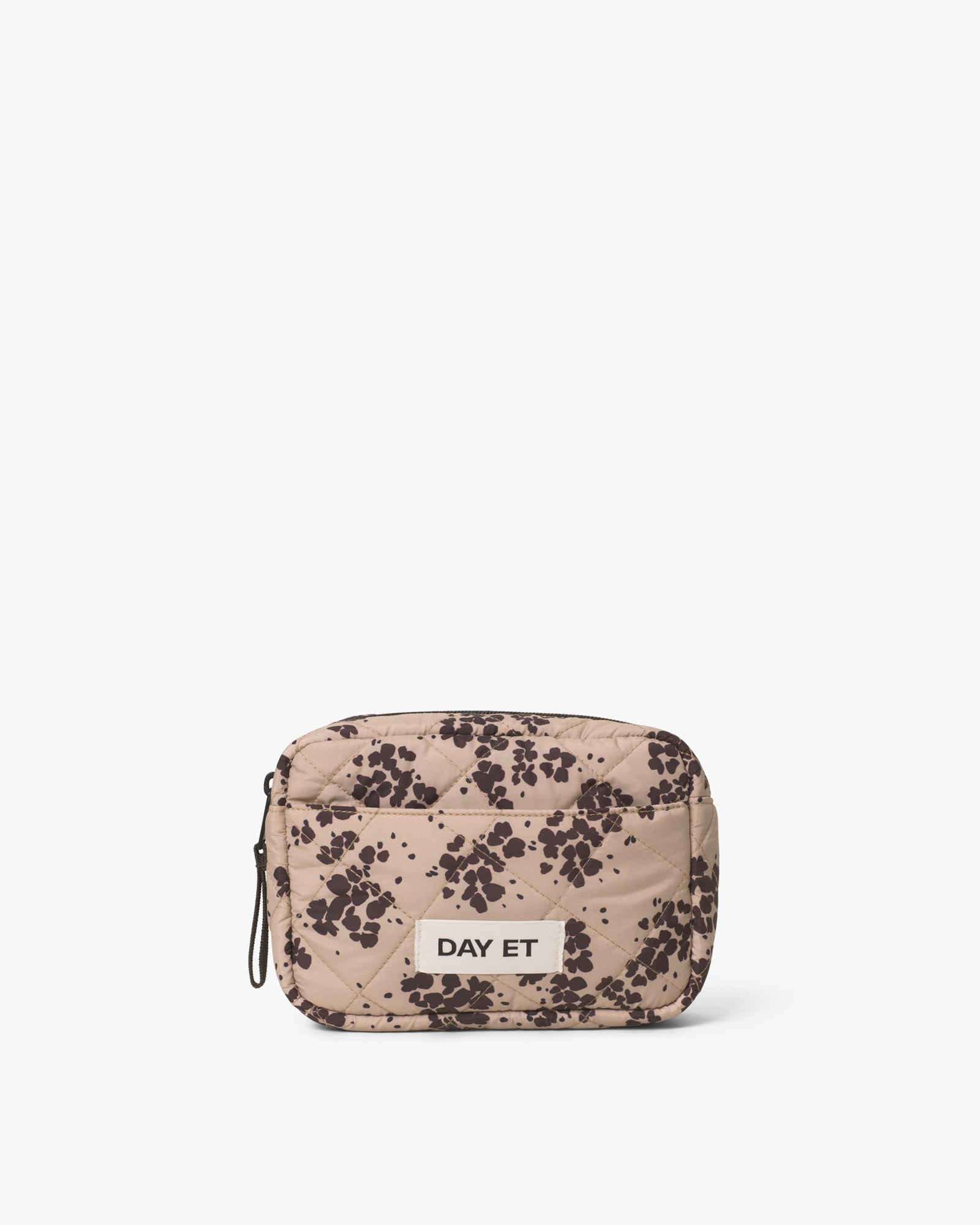 En kompakt toilettaske med quiltet blomstret print. Den har tre indvendige lommer og en udvendig lomme, som gør det let at holde styr på småting. Både yderstof og inderfor er lavet af 100% certificeret genanvendt materiale.