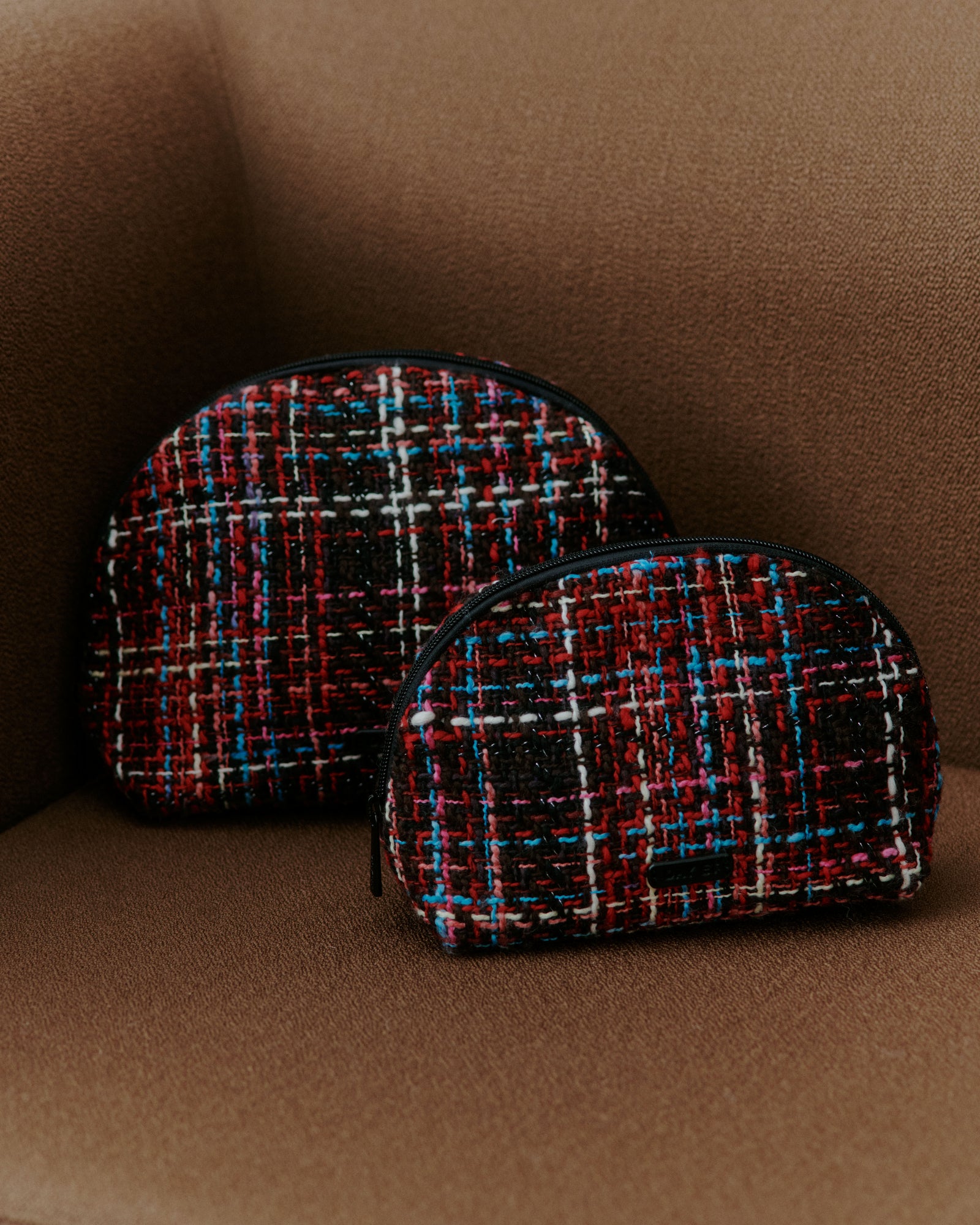 Denne mellemstore pouch er lavet i multifarvet bouclestof og har en oval form med fast bund. Den lukkes med lynlås og har et lyst twillfor indvendigt med en praktisk lynlåslomme. Perfekt til at have stående fremme til opbevaring af småting i hverdagen eller i tasken.