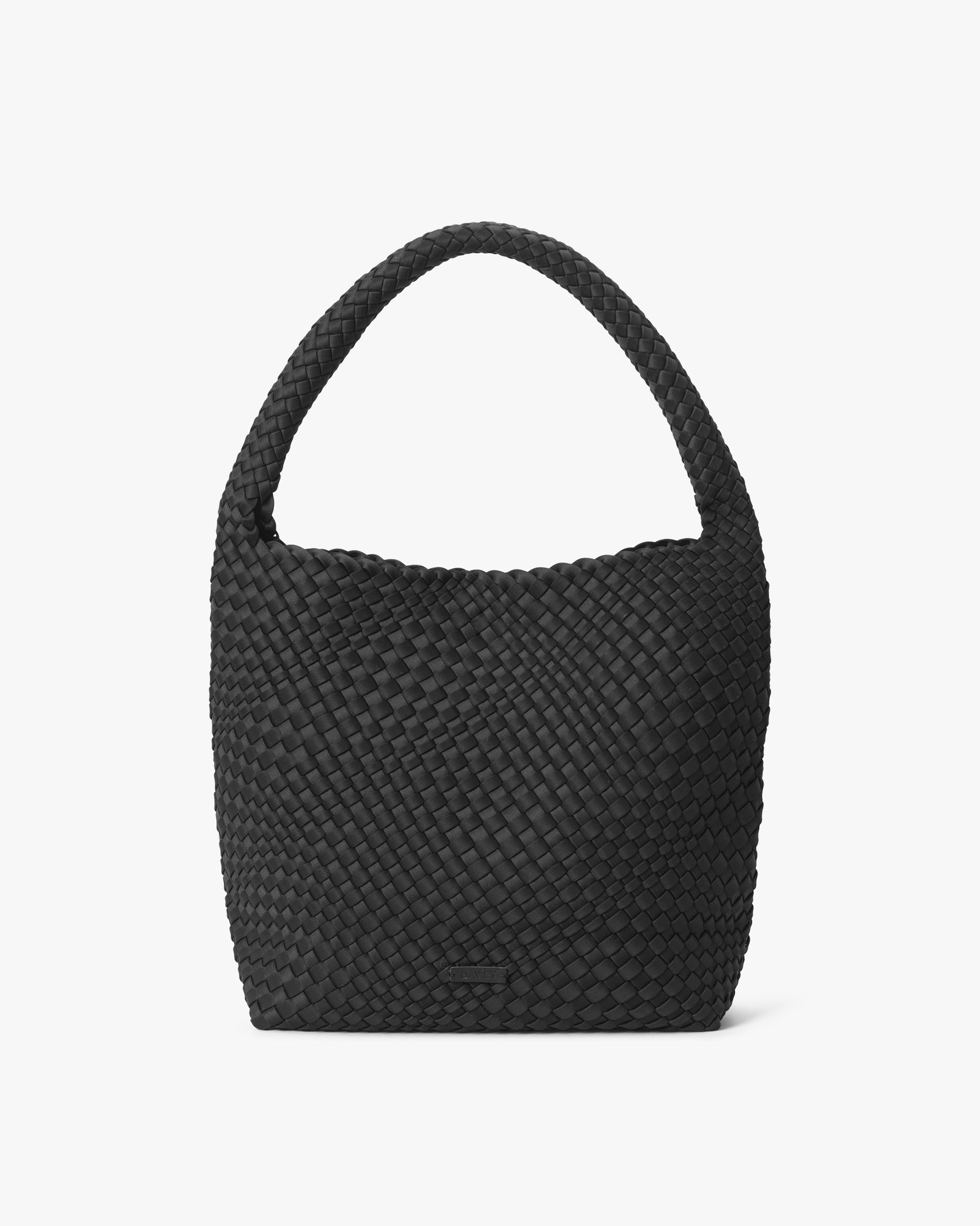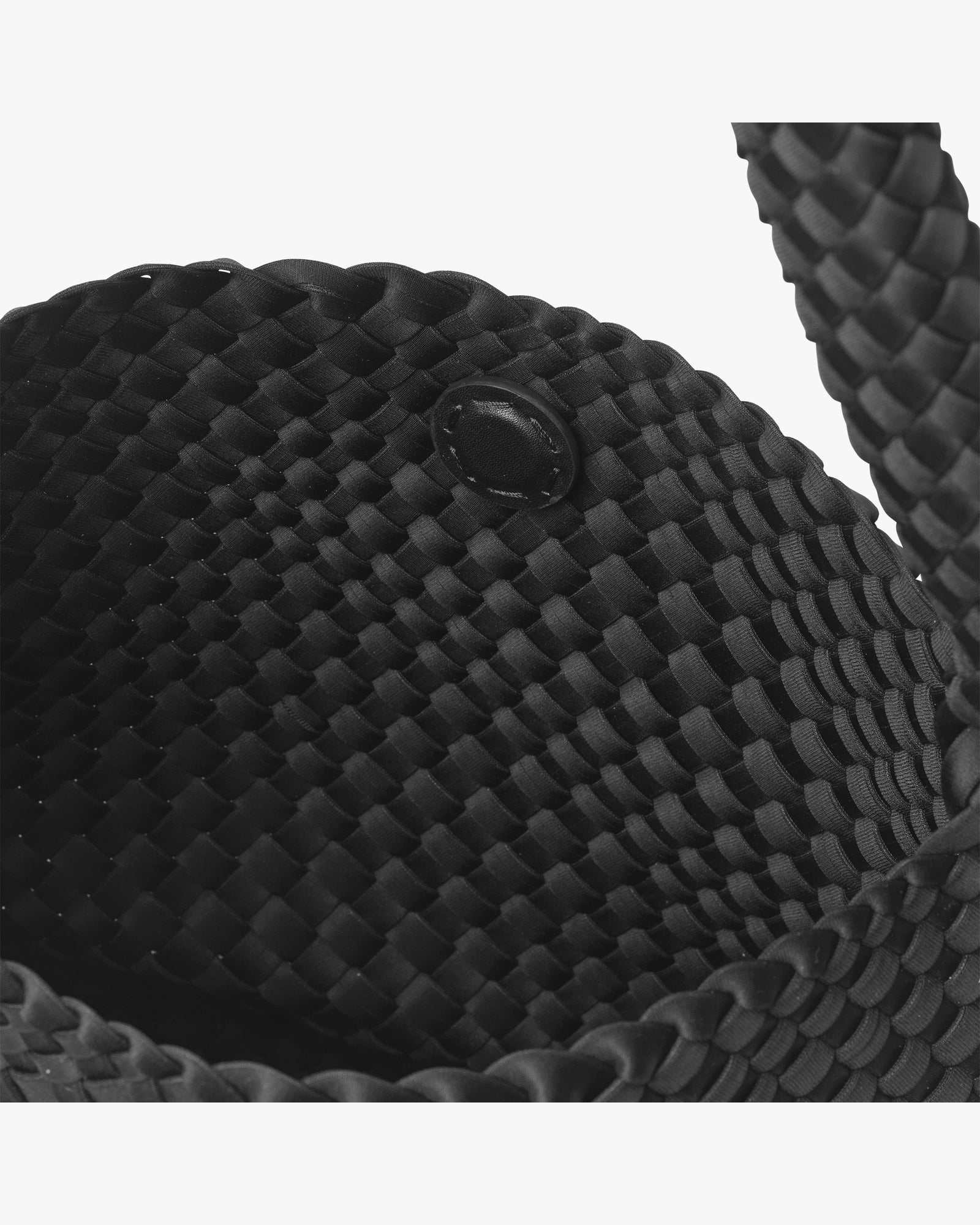 En rummelig skuldertaske med et karakteristisk udtryk. Tasken er håndflettet i ét stykke neoprenmateriale, som både er blødt og struktureret på samme tid. Den lukkes med en skjult magnet og har en fast bund, der sikrer en stabil form. En moderne taske, der kombinerer funktion og form i ét samlet udtryk.