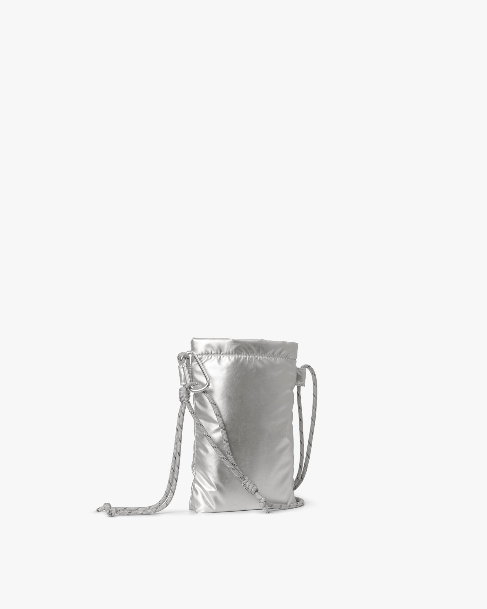 En kompakt taske designet til at holde din telefon tæt på, når du er på farten. Den justerbare paracord-strop gør det nemt at tilpasse længden, og karabinhagen gør tasken nem at tage af og på – perfekt under en jakke eller fastgjort til en anden taske. Det lette materiale og det sølvfarvede finish giver et stilrent udtryk. Taskens yderstof og inderfor er lavet af 100% certificeret genanvendt materiale.