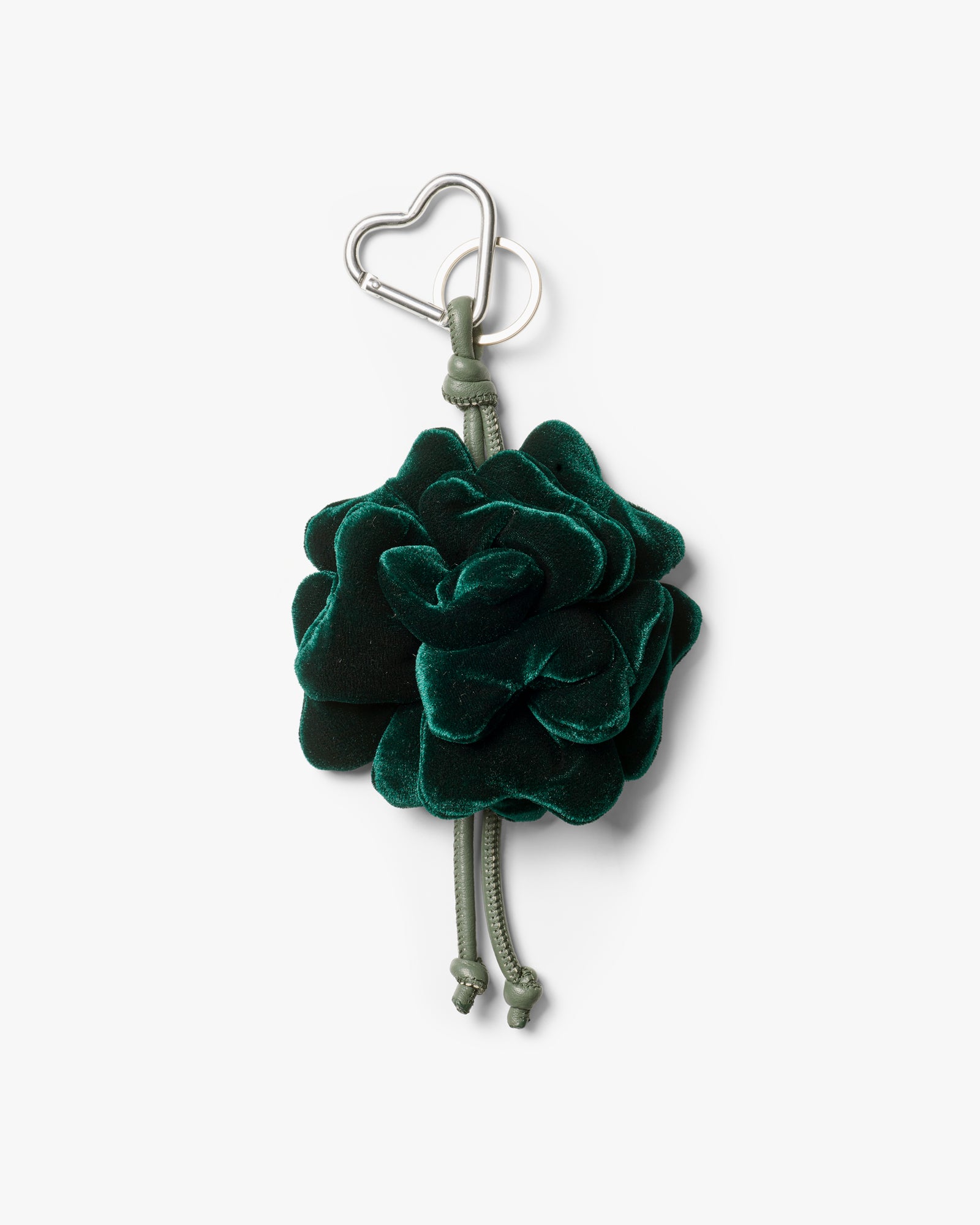 Charm med stor velourblomst og hjerteformet karabinhage. Kan sættes på tasker eller nøgler og tilføjer en dekorativ detalje.