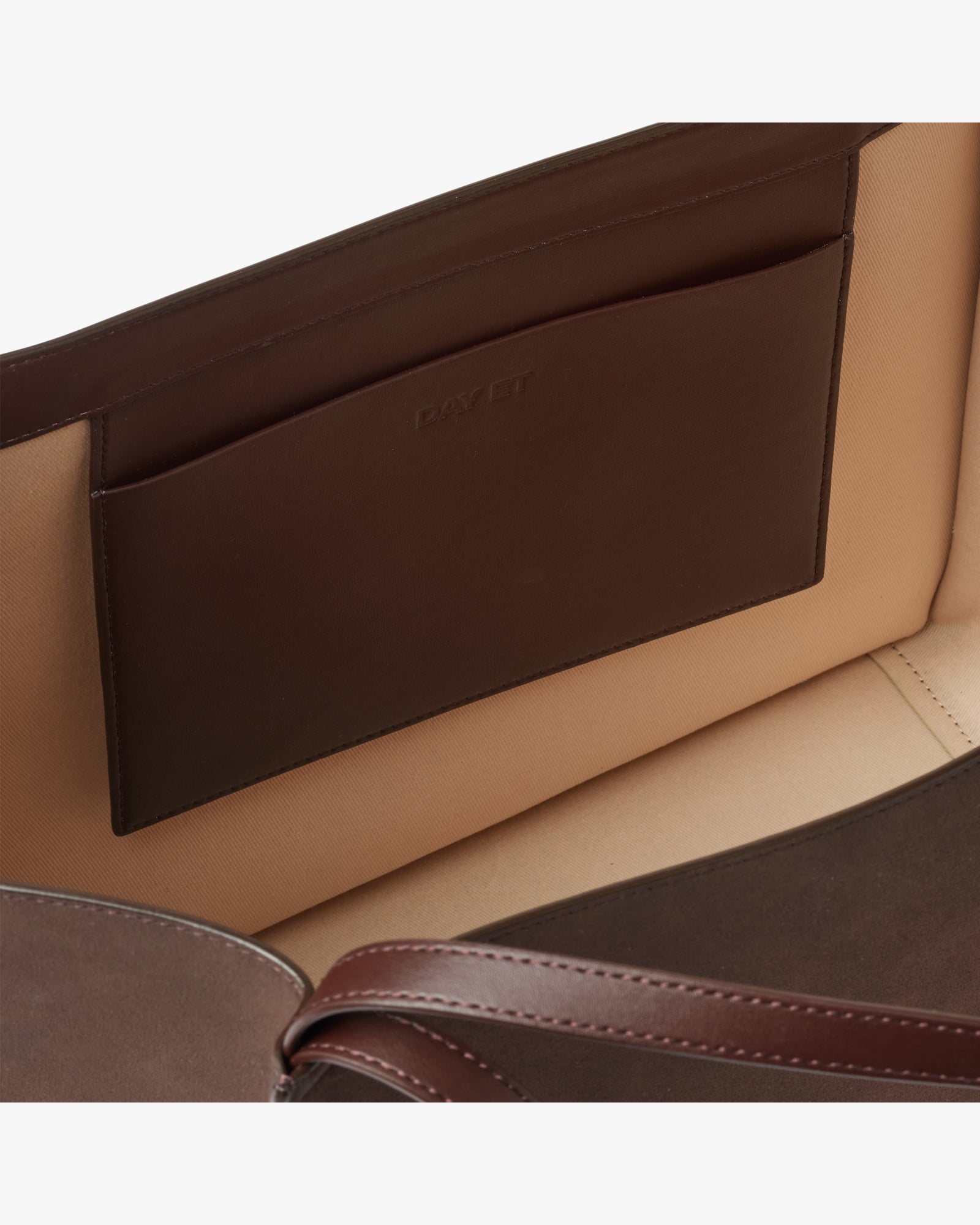 Denne rummelige skuldertaske har en skulpturel form og er fremstillet i blødt imiteret ruskind med detaljer i imiteret læder. Den har både håndtag og skulderstropper, samt fast bund, der giver struktur. Indvendigt har den et lyst twill-for og en åben lomme.