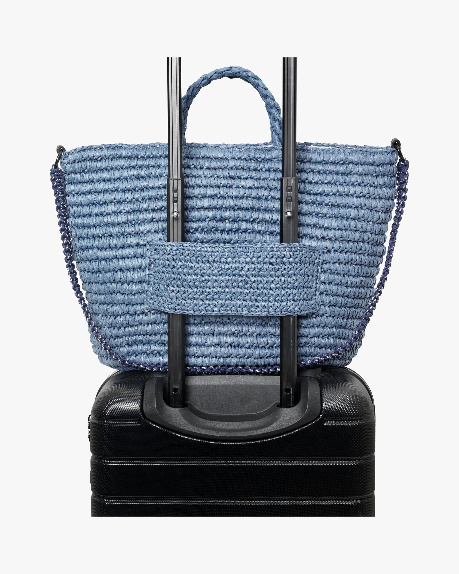 Denne bløde stråflettede taske er designet til rejsebrug og kan bæres enten i de korte hanke som håndtaske eller crossbody med den aftagelige strop i knyttet snor. Tasken lukkes med en trykknap og har et indbygget bånd på bagsiden, der gør det nemt at fastgøre den på en kuffert . Indvendigt er den foret med beige hørstof og har en praktisk sidelomme til småting.