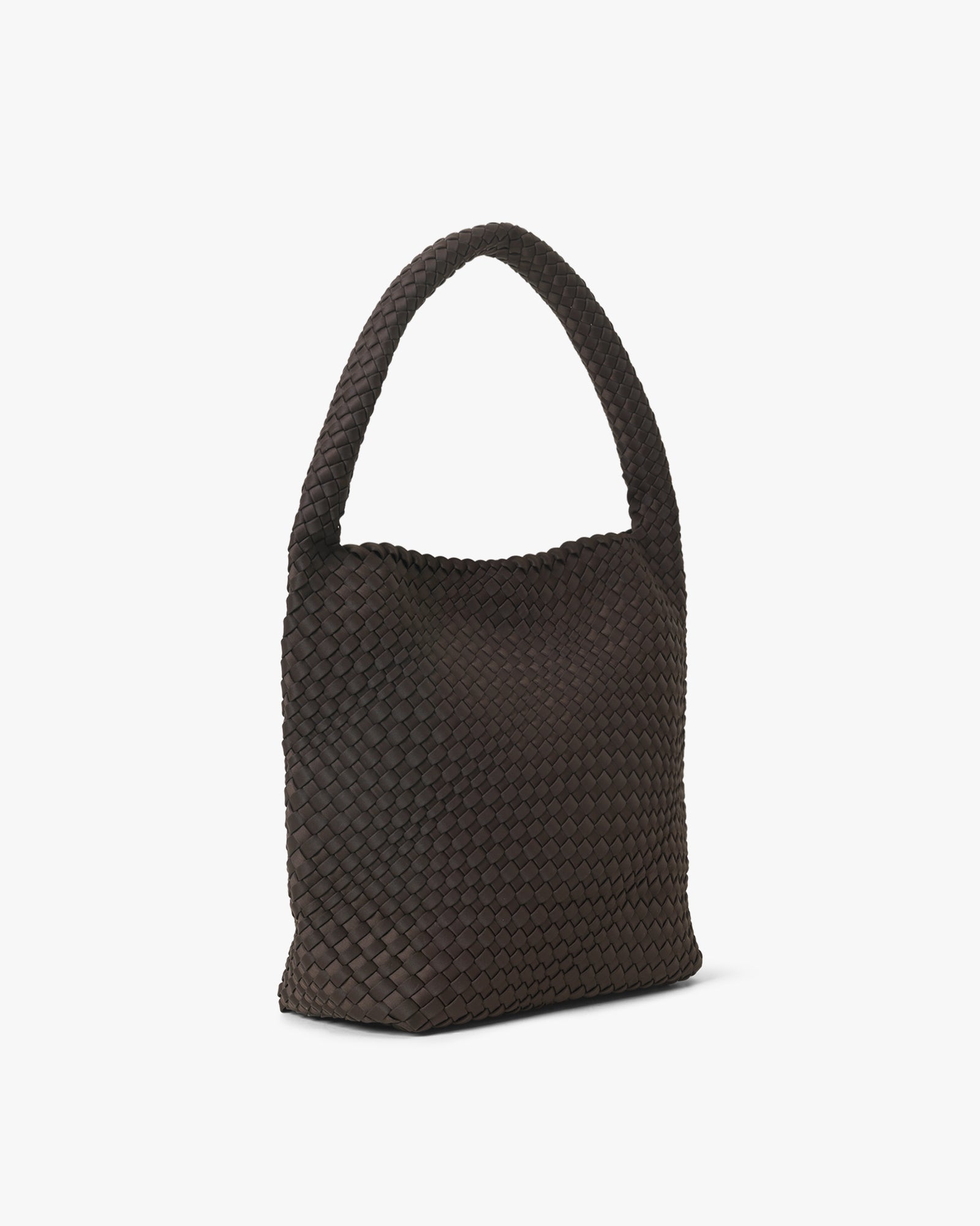 En rummelig skuldertaske med et karakteristisk udtryk. Tasken er håndflettet i ét stykke neoprenmateriale, som både er blødt og struktureret på samme tid. Den lukkes med en skjult magnet og har en fast bund, der sikrer en stabil form. En moderne taske, der kombinerer funktion og form i ét samlet udtryk.