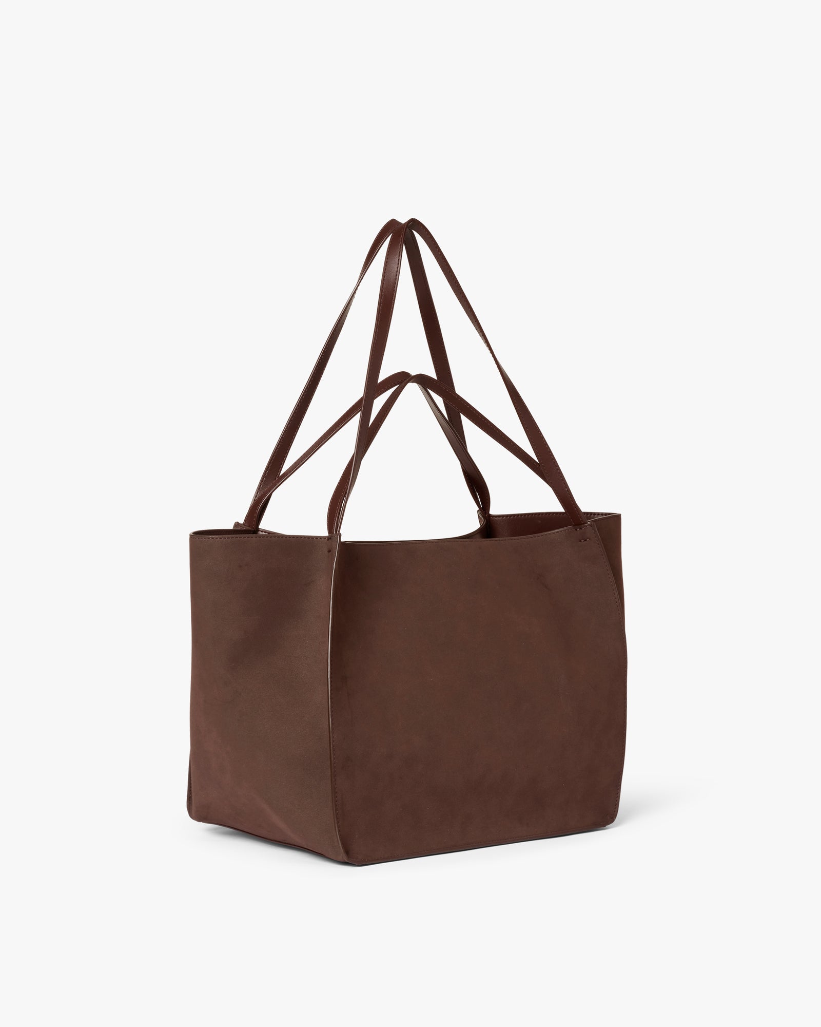 Denne rummelige skuldertaske har en skulpturel form og er fremstillet i blødt imiteret ruskind med detaljer i imiteret læder. Den har både håndtag og skulderstropper, samt fast bund, der giver struktur. Indvendigt har den et lyst twill-for og en åben lomme.