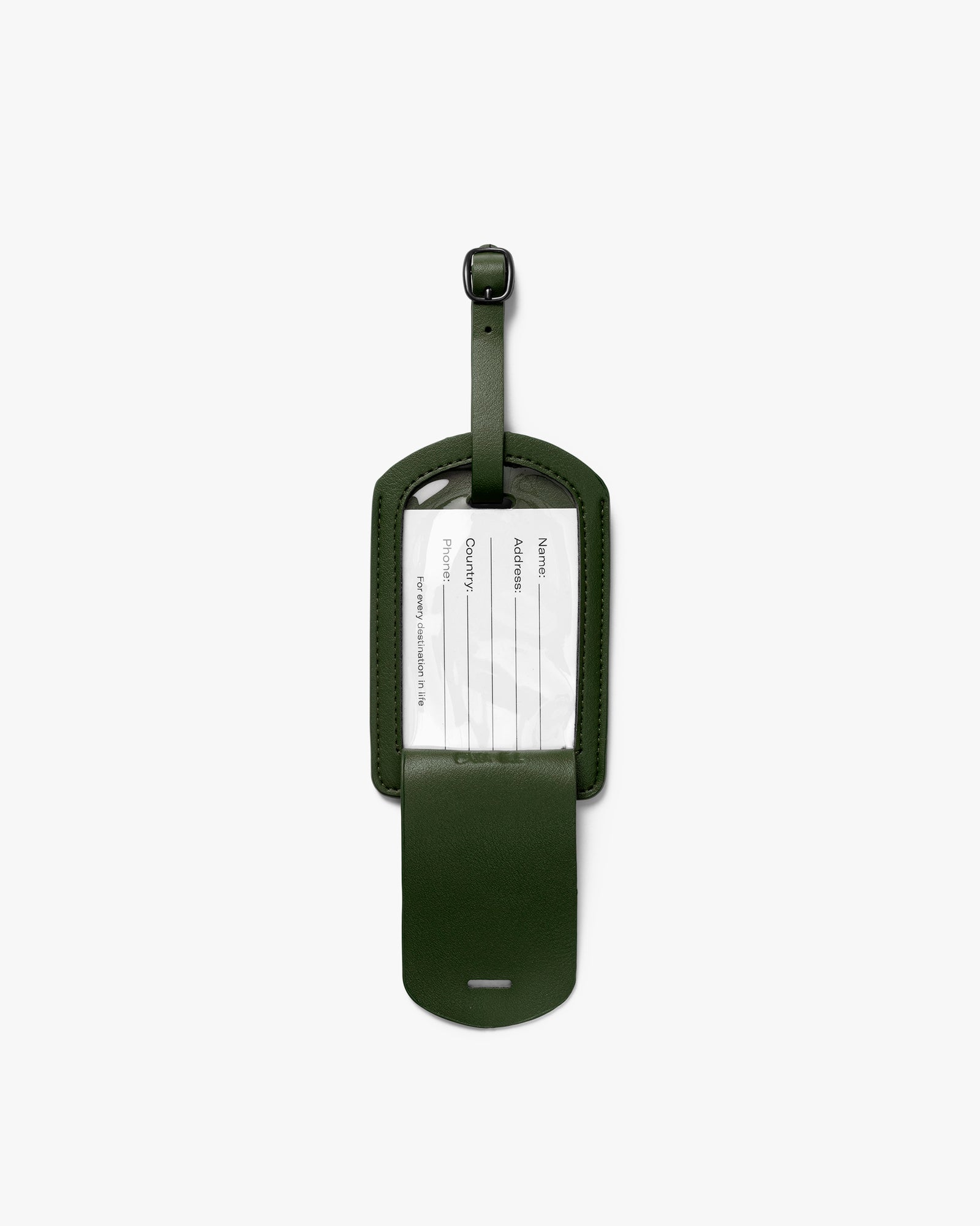 Dette kuffertmærke er designet i et læder lignende materiale. Det har et spænde, så det kan sættes om håndtaget på en kuffert. Kuffertmærket kan åbnes, og indeni kan du skrive dit navn, adresse, land og telefonnummer.