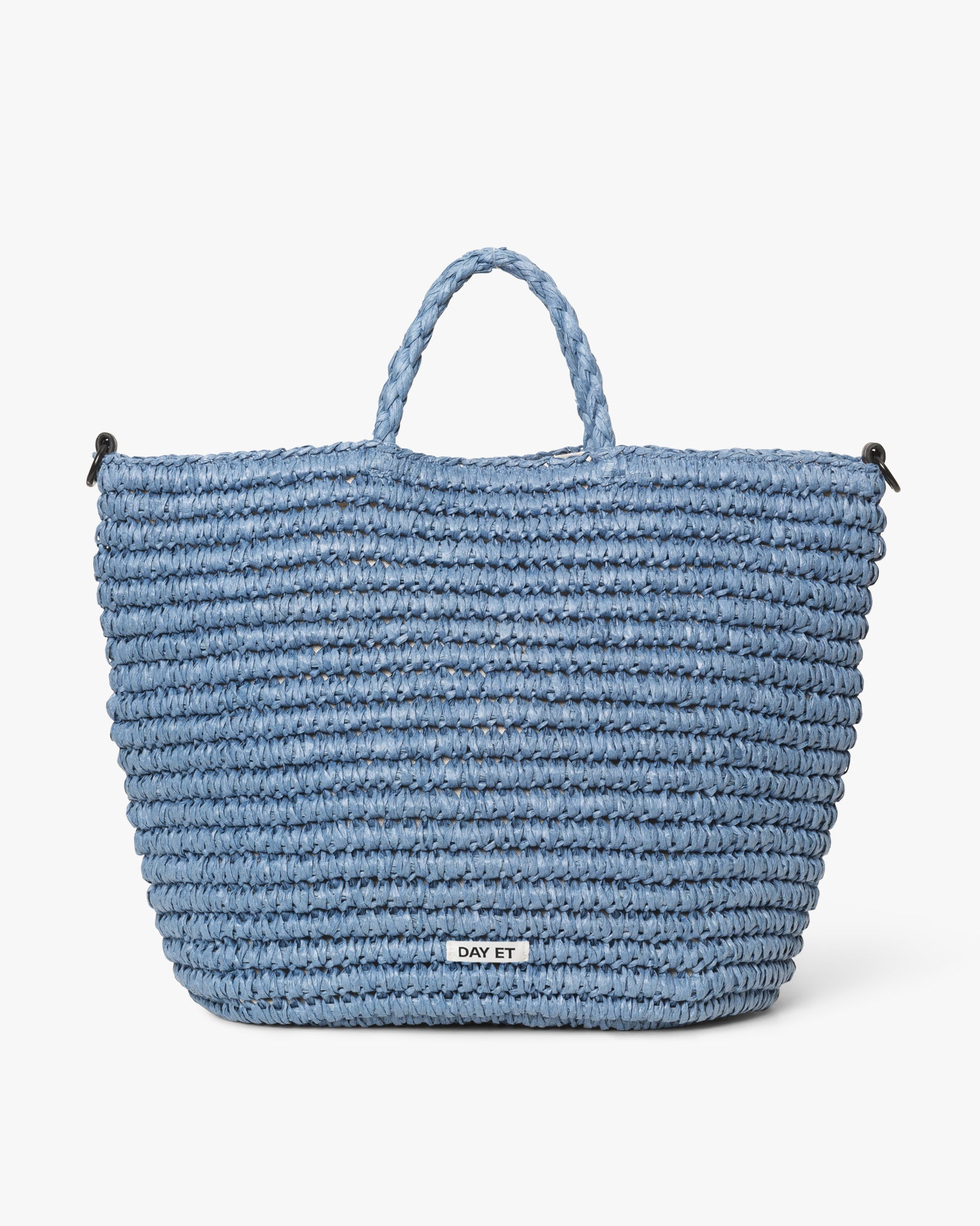 Denne bløde stråflettede taske er designet til rejsebrug og kan bæres enten i de korte hanke som håndtaske eller crossbody med den aftagelige strop i knyttet snor. Tasken lukkes med en trykknap og har et indbygget bånd på bagsiden, der gør det nemt at fastgøre den på en kuffert . Indvendigt er den foret med beige hørstof og har en praktisk sidelomme til småting.