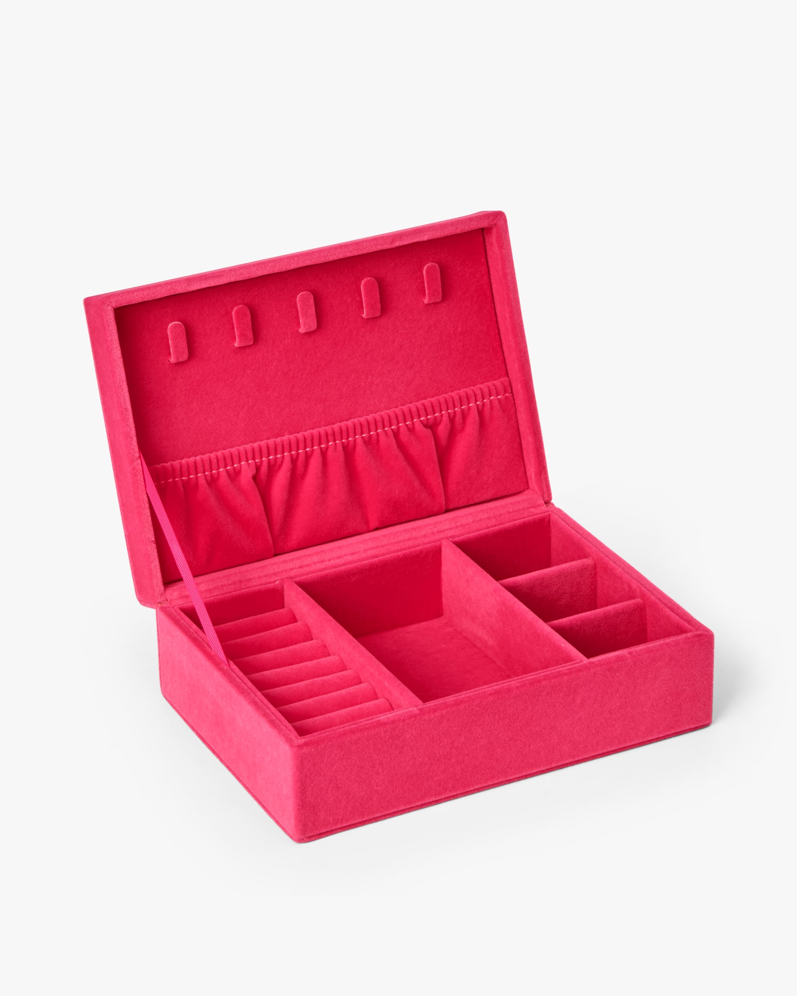 Et rummeligt smykkeskrin i blød velour. Skrinet har flere adskilte rum og en sektion i låget til halskæder. Magnetlukning og et diskret logo fuldender det funktionelle design.
