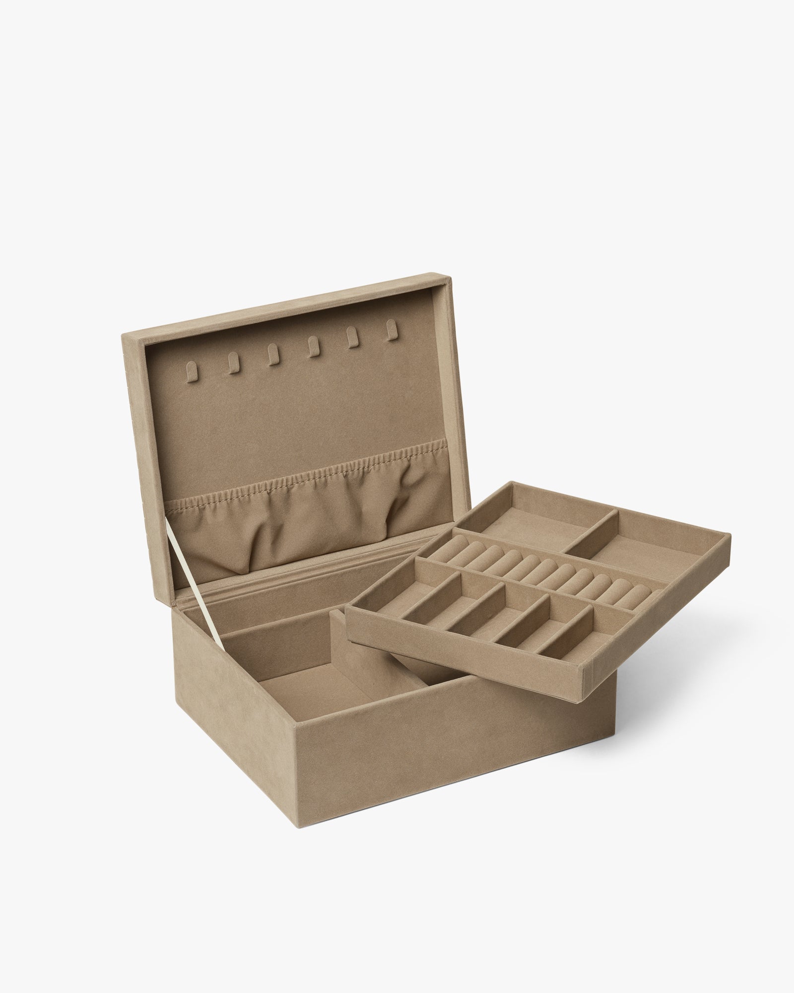 Dette rummelige smykkeskrin er perfekt til opbevaring af alle dine smykker. Det er designet i velour med quilt detaljer, og fortil har det Day Et logoet i sølv. Det har en magnetisk lukning, og indeni har det flere rum, så du kan organisere dine smykker. Det har også en bakke, som kan løftes, hvilket giver et ekstra rum, hvor du kan opbevare dine smykker.